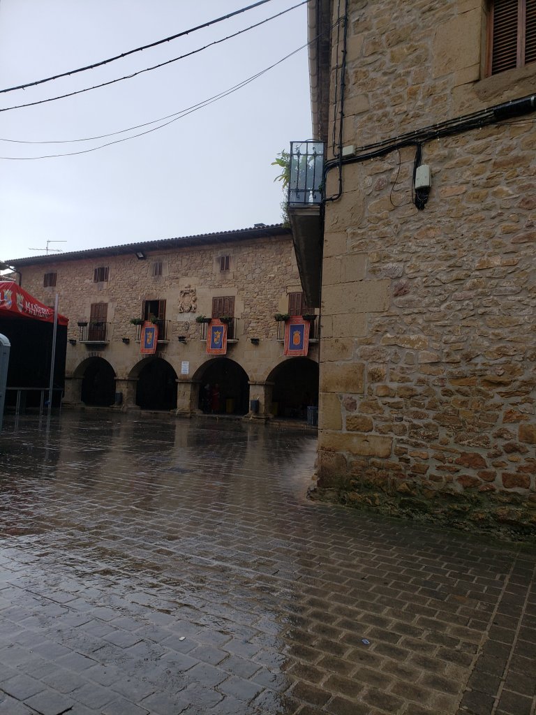 Maybe it was a good thing, as the fear of being charred took my mind off the big climb over rocky, muddy roads. We arrived at the next town (Mañeru) and luckily found a covered area by the fountain. There was a group of 20-somethings chatting there, and we all shared the dry spot for a spell and contemplated whether to wait or charge through the rain.