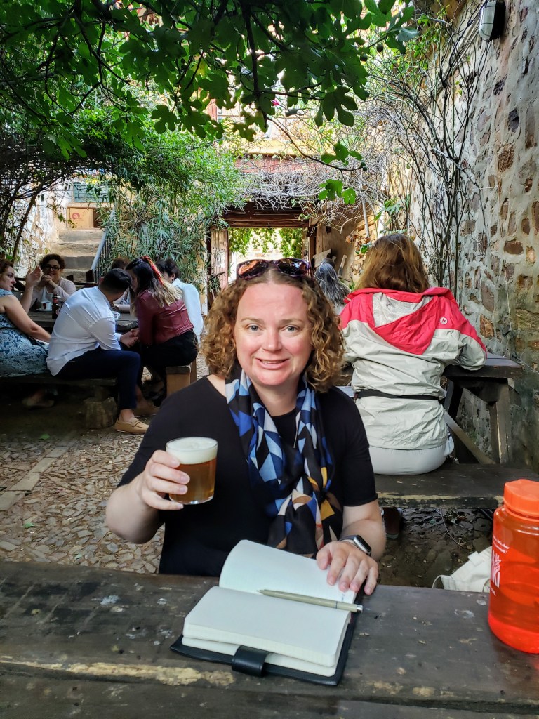We are worried there wouldn’t be any bars open to relax and journal before dinner, but thankfully we find the atmospheric El Trechiro that brews its own beer. We sit in the pleasant stone wall courtyard with vines growing over the walls, and it is one of my favorites on the whole Camino.