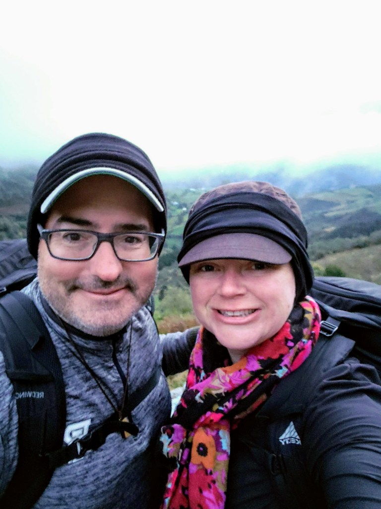 Under an awning for cover, I help J’Nell take off the blue poncho. She then gets the light plastic one we’ve been wearing that is more like a trash bag, puts it on, and then fits the other one over it. I am stubborn and still pissed off, and keep wearing the one that doesn’t keep me dry. But truly nobody to blame here other than myself as I should have bought a real one from REI before leaving. I’ll eventually do the same as J’Nell and use the plastic poncho as an inside liner later in the day.