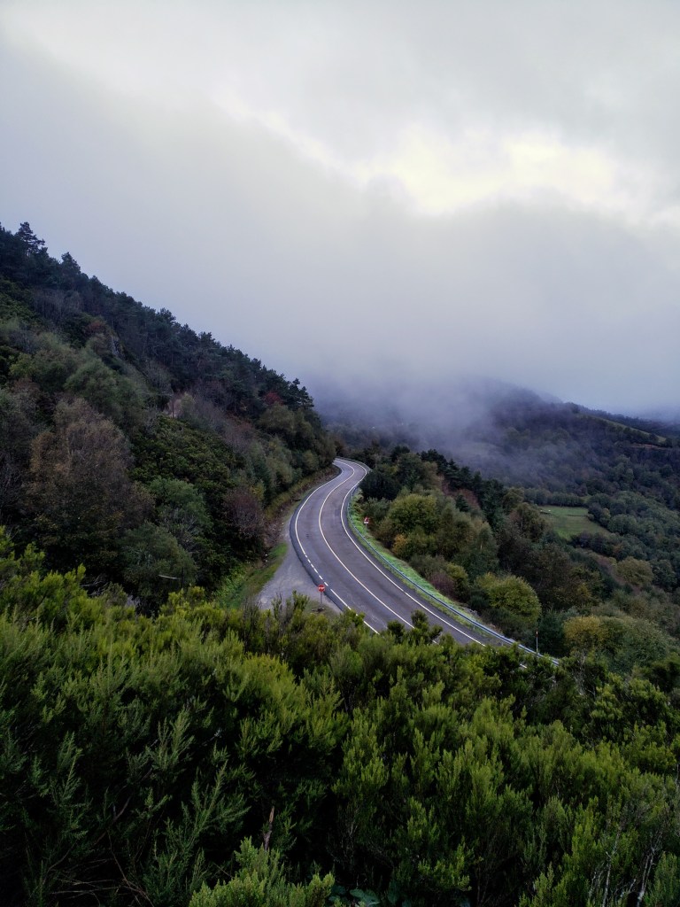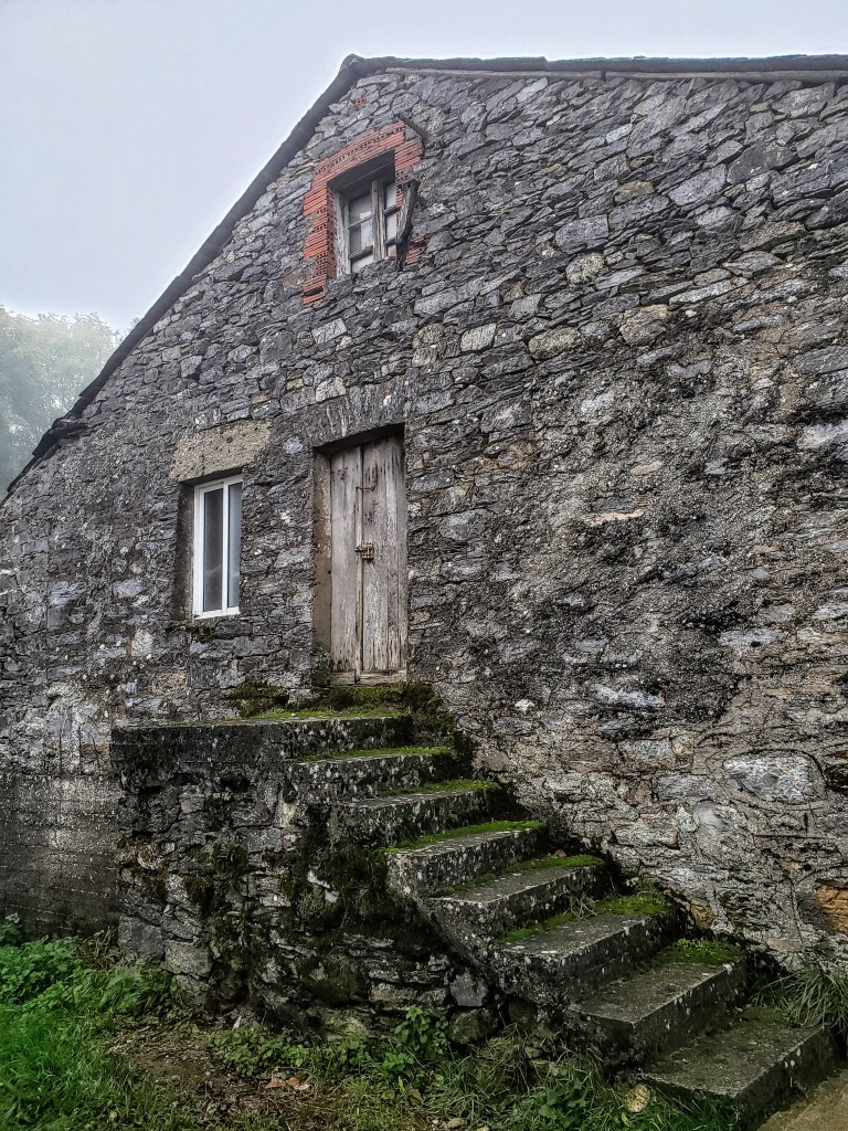 In Hospital de la Condensa we ring the bell of their church, and it’s a wonderful feeling tugging on the rope and hearing that chime. Soon afterwards we don our light, plastic ponchos as the mist turns to rain. There is a steep incline ahead and I try to crest it as fast as I can in this weather. At the top we continue in the inclement conditions for another 3 kilometers to Fonfria, where we warm up with coffee, a sandwich and a cheesecake at a cozy place called A Reboliers.