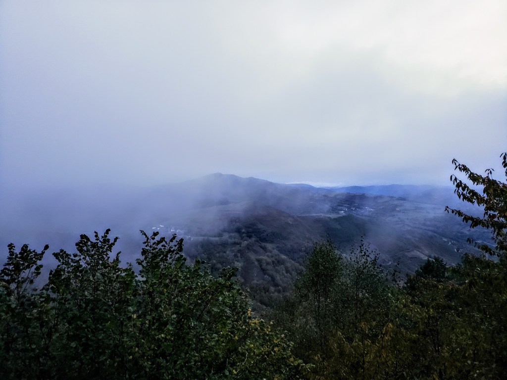 The municipal albergue in O’Cebeiro has an 8 am check-out time, and stepping outside, the mountain air chills my hands and face. J’Nell and I have breakfast and then walk over to the stone wall at the edge of town. It’s too early for sunrise, but the sky grows lighter in the stillness of the dawn over the valley, and we are treated to a foggy and mystical view.