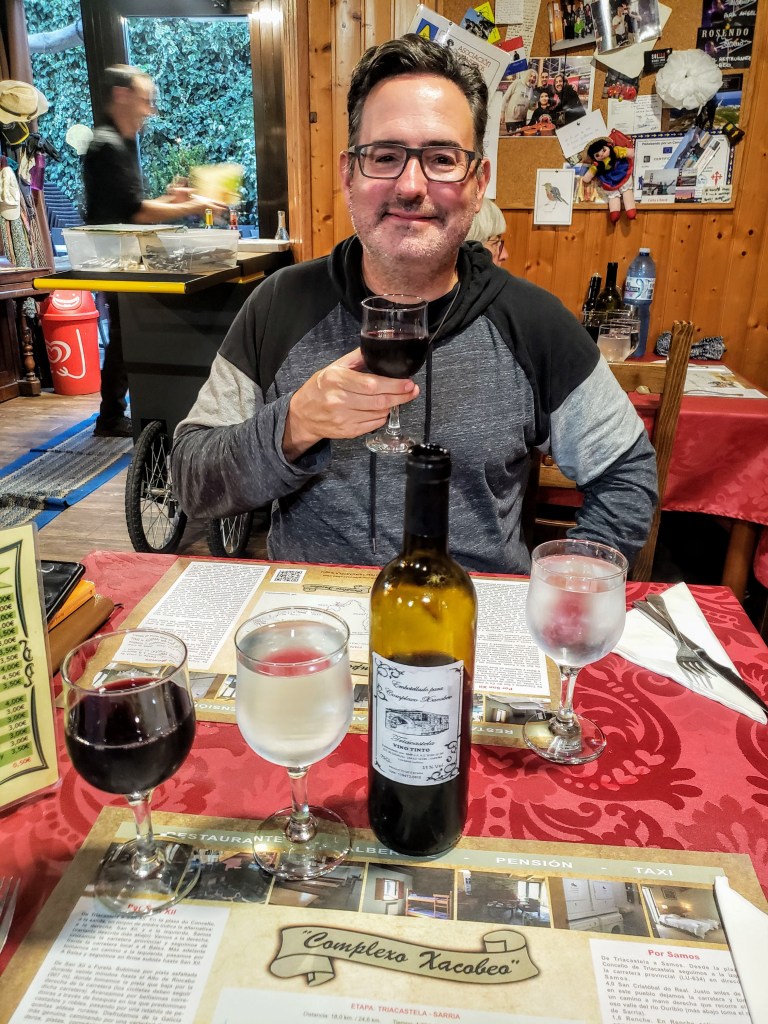 We next pass an 800 year old gigantic Chestnut tree with its gnarly branches and thick trunk, and it’s only a short walk to Triacastela (named after the three castles that long ago stood in the town). After showering we get beers and write in our journals at restaurant & bar Complexo Xacobeo.