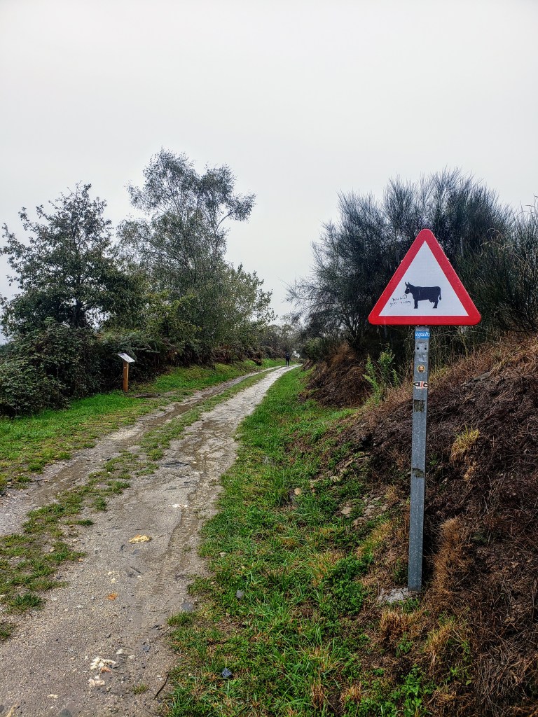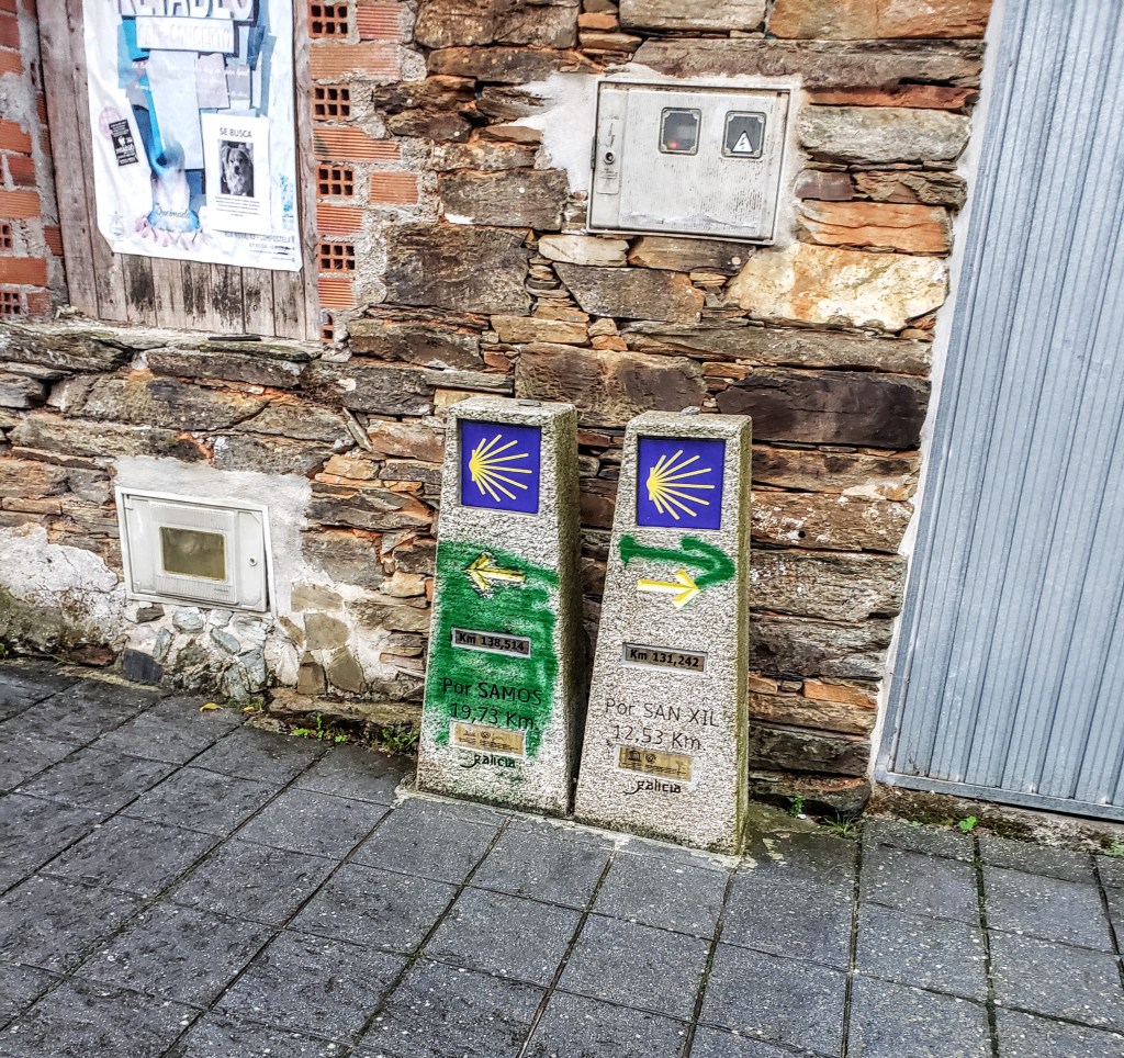 There are two paths to Sarria, and while one is more remote and takes you to a beautiful monastery, it also adds 6.4 kilometers to the day’s walk. That was out of the question in this weather, and likely would have been even if it was sunny. So at 9:30 am we take the path to the right marked San Xil.