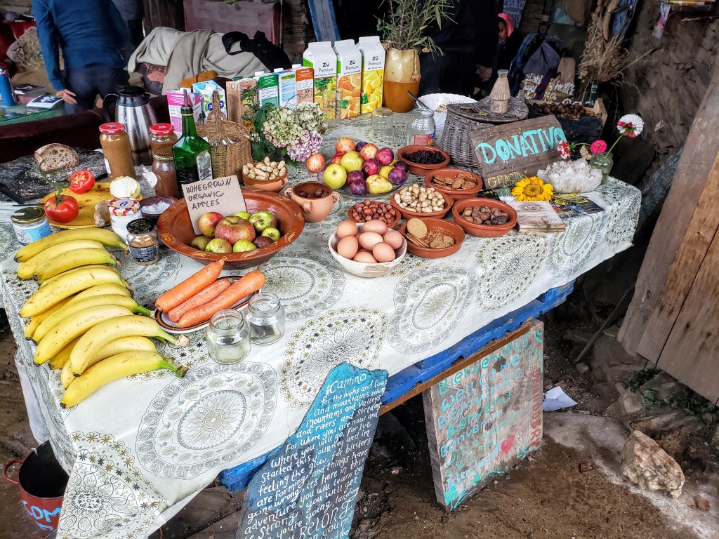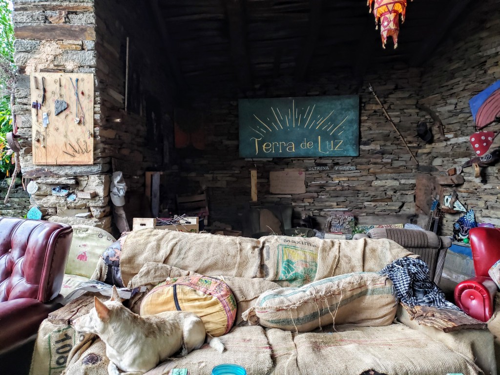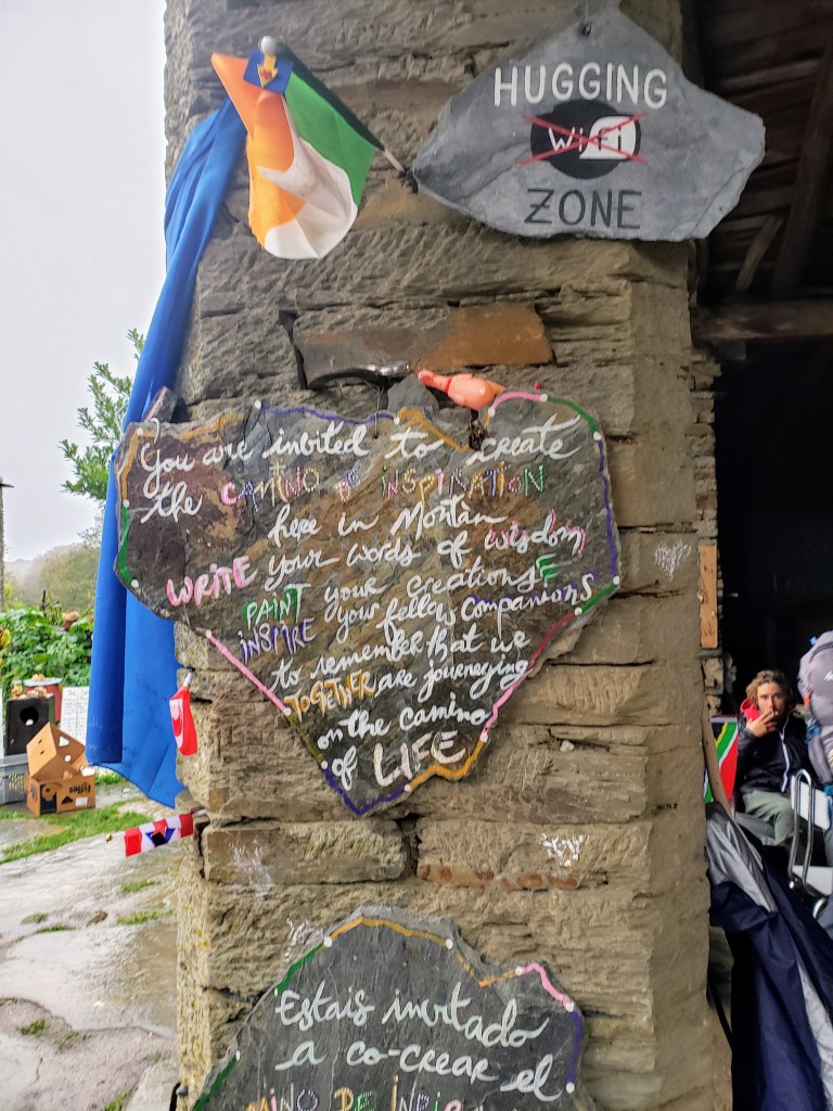 Just when you think there is nowhere to shelter from the rain, we reach Terra de Luz, a cozy commune/donativo pilgrim’s oasis. There we see and chat with Sophie from France, who was part of the Meseta crew who became a big part of our Camino family. I have green tea, a banana, and a cookie while getting a respite from the rain; we will show our appreciation with lots of gracias and also leave a donativo (donation) to help restock for the next group of pilgrims.