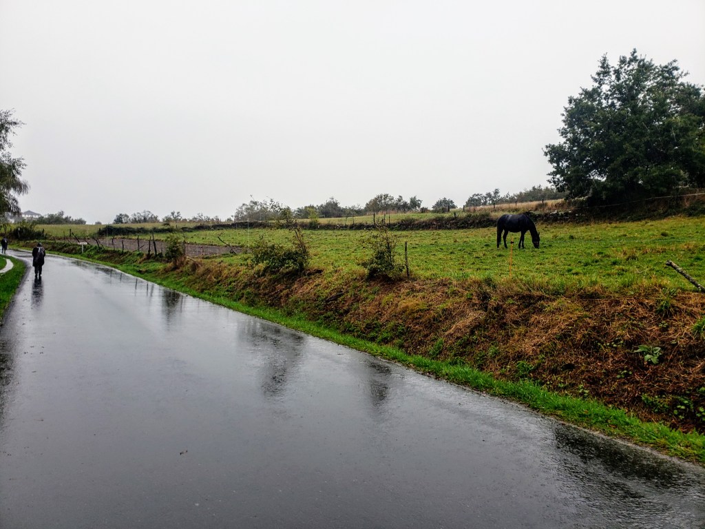 We are still 12 klicks from Sarria, and every kilometer would be tough ones in the non-stop rain. We see plenty of cows, some horses, more green fields, and lots of trees. We don’t pass any cafes, making us even more grateful the commune was open.