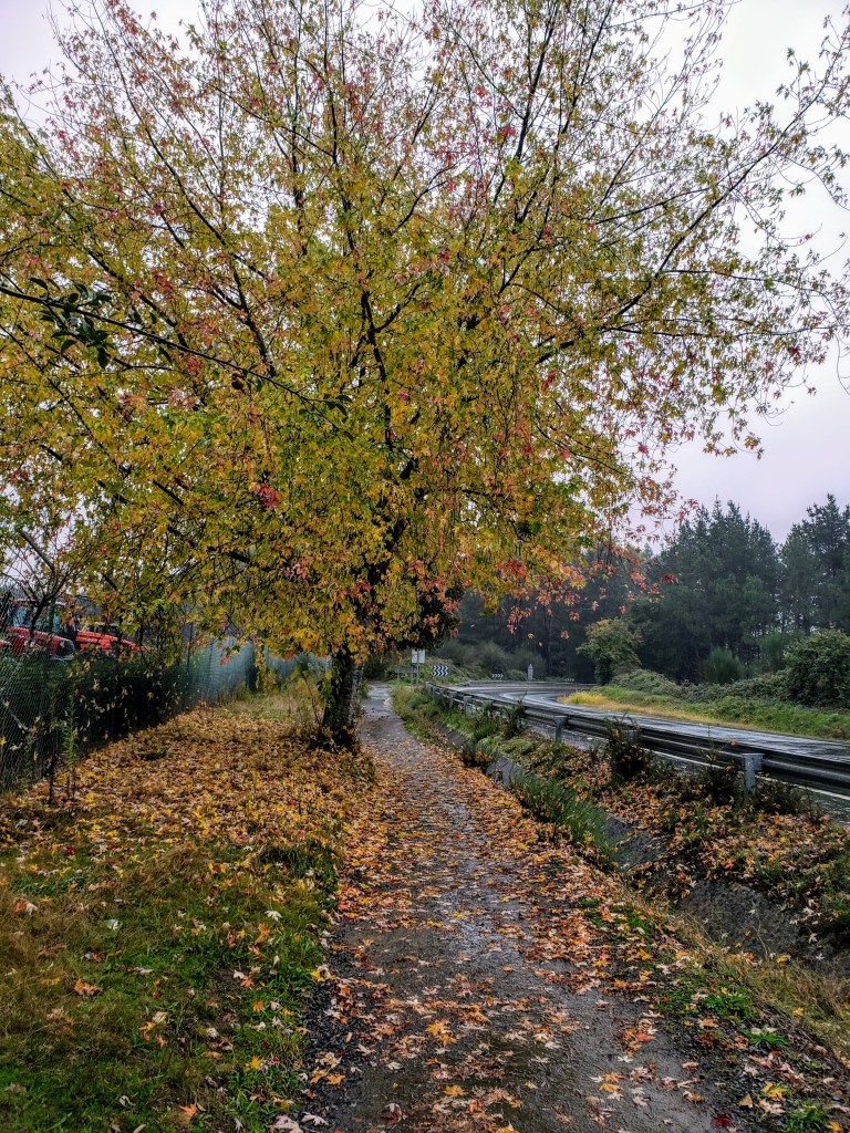 However, as far as culture and beauty goes, today’s walk, when compared to the rest of the Camino, is lacking. Though it isn’t all bad, and there are appealing trees with overhanging branches showing off fall foliage, a few pretty green fields, and it’s mostly flat except a couple of steep (and long) hills. The best part of the day is the delicious soup, sandwich and beer we have at the warm and friendly restaurant at Hotel Amenal, about 25 minutes from Lavacolla. The next best thing is once again there are hardly any people!