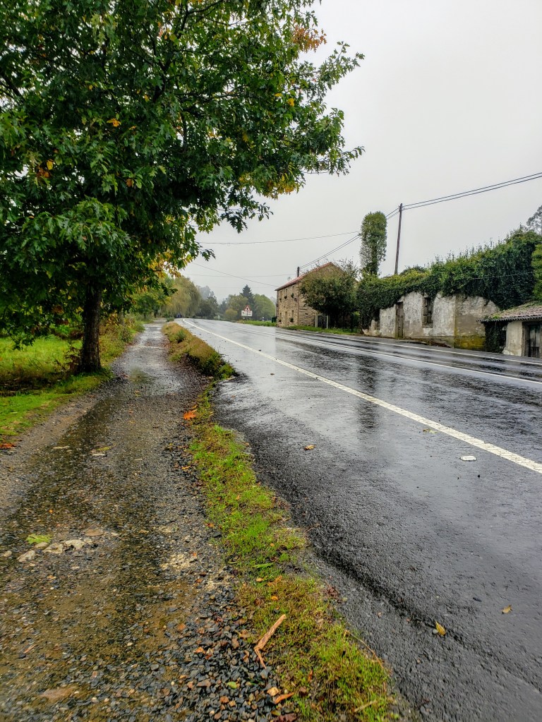 Like the walk into Sarria, J’Nell and I get rained on from the moment we step out the door this morning until we reach our hostel in Lavacolla. But thankfully it is mostly light precipitation and not much wind until the end, and there are plenty of covered forests to help lessen the wetness. It also isn’t that cold, I’m going to say maybe 60 degrees.