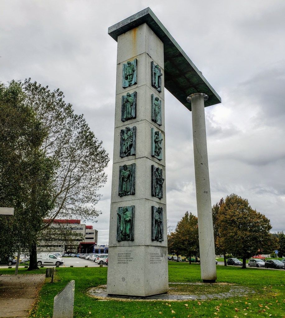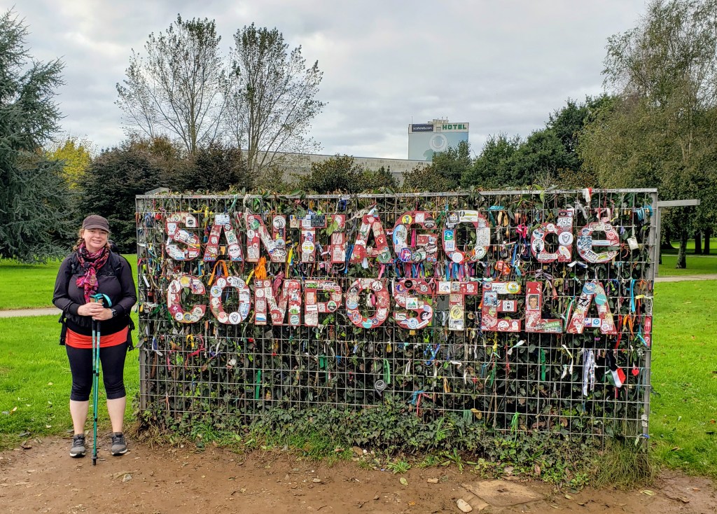 After crossing a bridge, we reach the outskirts of the city and enter a park called Praza da Concordia. There’s a cool Santiago de Compostela sign and we get a picture with it, as well as admire a tall (maybe 50 feet high), modern sculpture/portal called Porta Itineris Sancti Lacobi. We walk through this gateway, which welcomes all pilgrims entering the city.