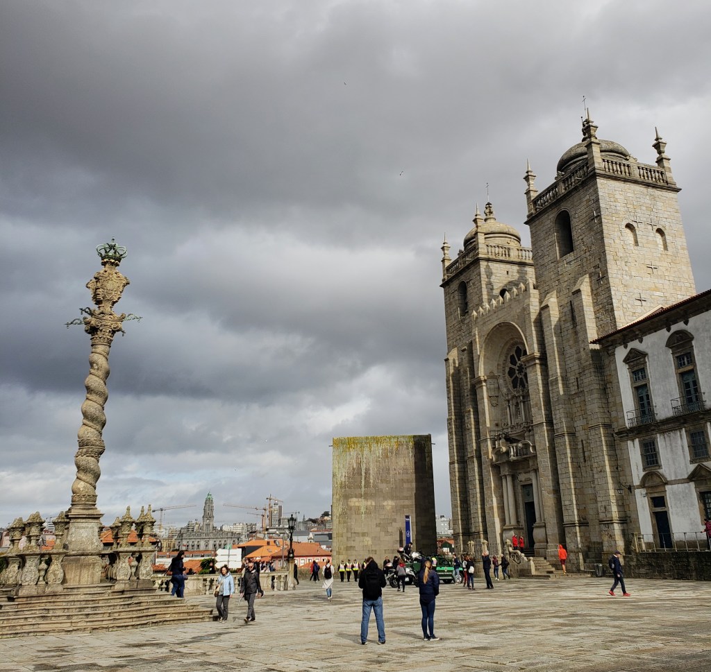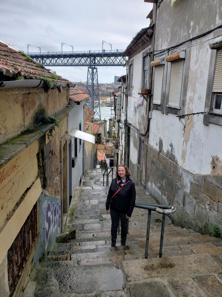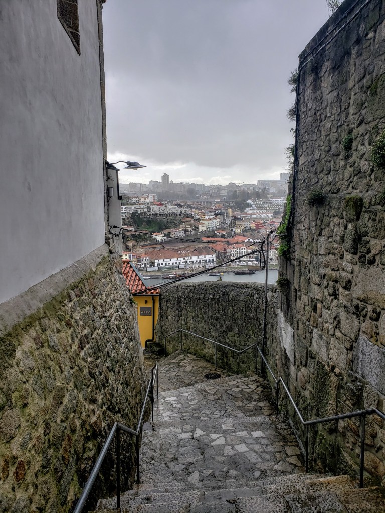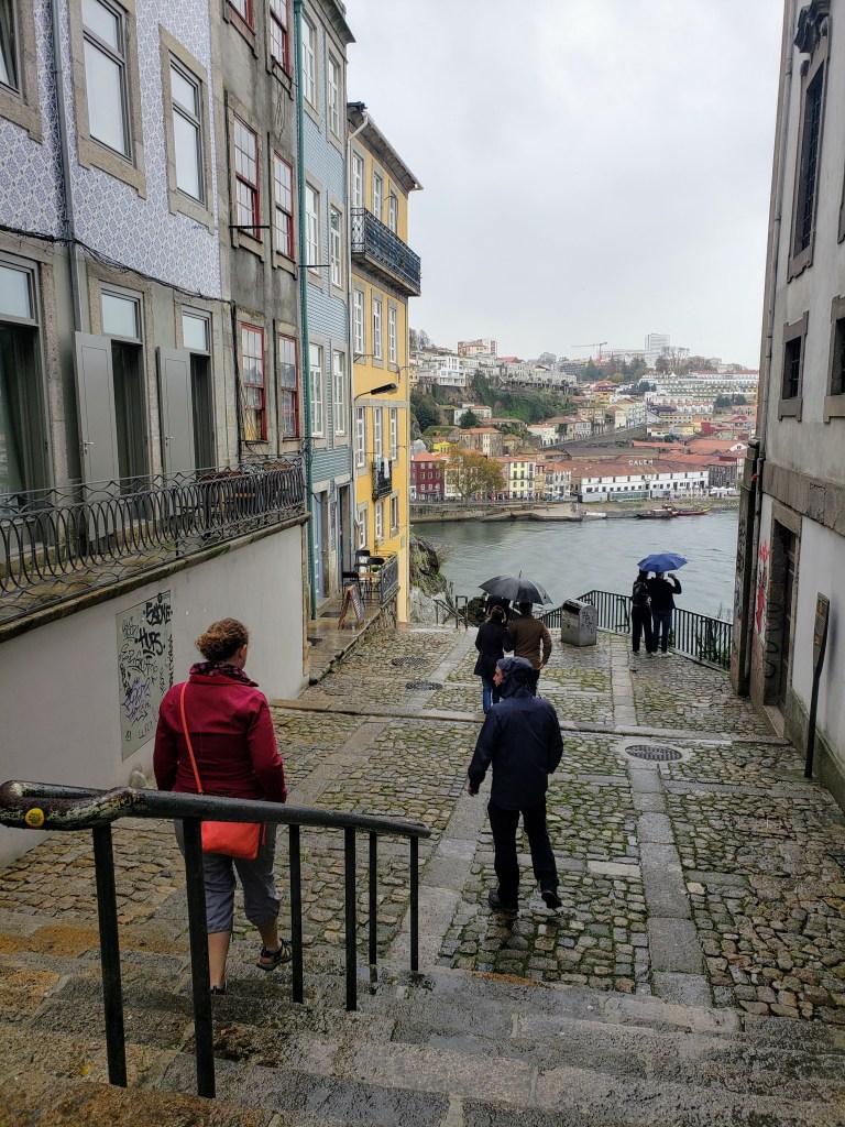 While we didn’t go into the cathedral or the Bishop’s Palace next door (the two big attractions), when a rainstorm rushed in on us we ducked inside an 18th Century chapel that turned out to be Porto’s Camino de Santiago welcome center. For us former pilgrims that was a serendipitous surprise, and as we did throughout our hike across Spain, I got a stamp (in my journal). When the skies cleared we descended the ancient stone passageway, and savored the history and the views of the bridge and the happenings across the river.