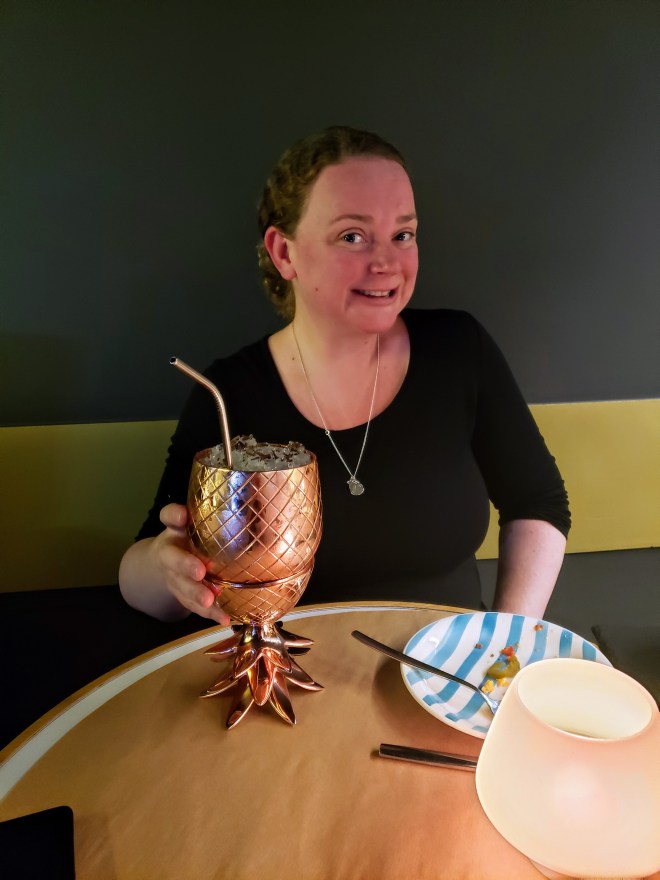 - I Loft: A swanky place that has excellent Mexican food and professional service. They have a cool cocktail scene as well, as evidenced by J’Nell’s copper pineapple beverage below.