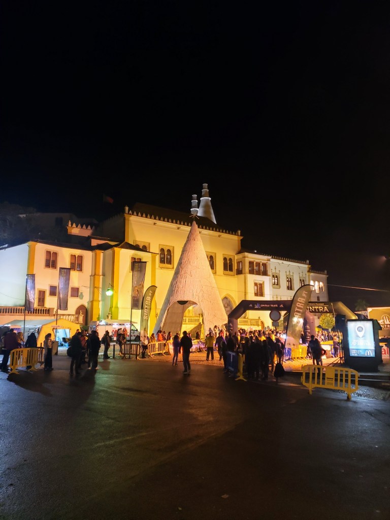 About half the way down we saw a restaurant with a nice view of the town, aptly named Sintra Terrance. It ended up being a wonderful place to stop for wine, a cheese plate, and to forget about my fall. Dusk turned to dark, and continuing our descent we saw runners with numbered bibs getting ready for a road race. We popped inside a tavern at ground level for more wine and to watch the start, and then moved to an outside café at the finish line for desert, coffee, and Portuguese brandy. Thankfully they had heating lamps, as the temperature had become frigid.